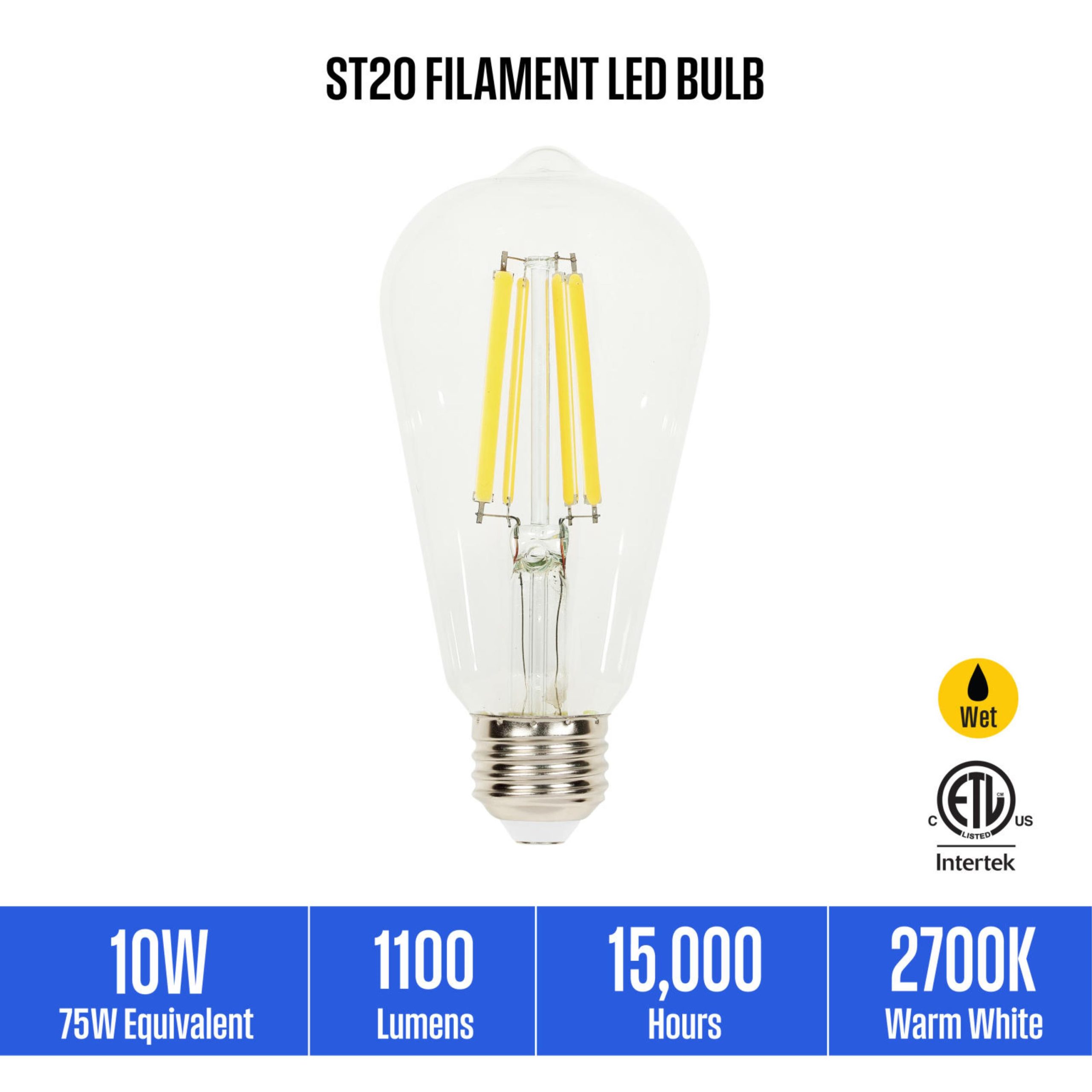The Westinghouse 6-pack of 10W ST20 Filament Dimmable LED Light Bulbs brings distinctive character to pendant lights and chandeliers where the bulb is visible, enhancing the look with retro-inspired Edison bulb style. These LEDs illuminate instantly with 2700K warm white light, feature a medium base, and are suitable for wet locations and enclosed fixtures such as outdoor-rated wall lanterns. Long-lasting LEDs are mercury-free.