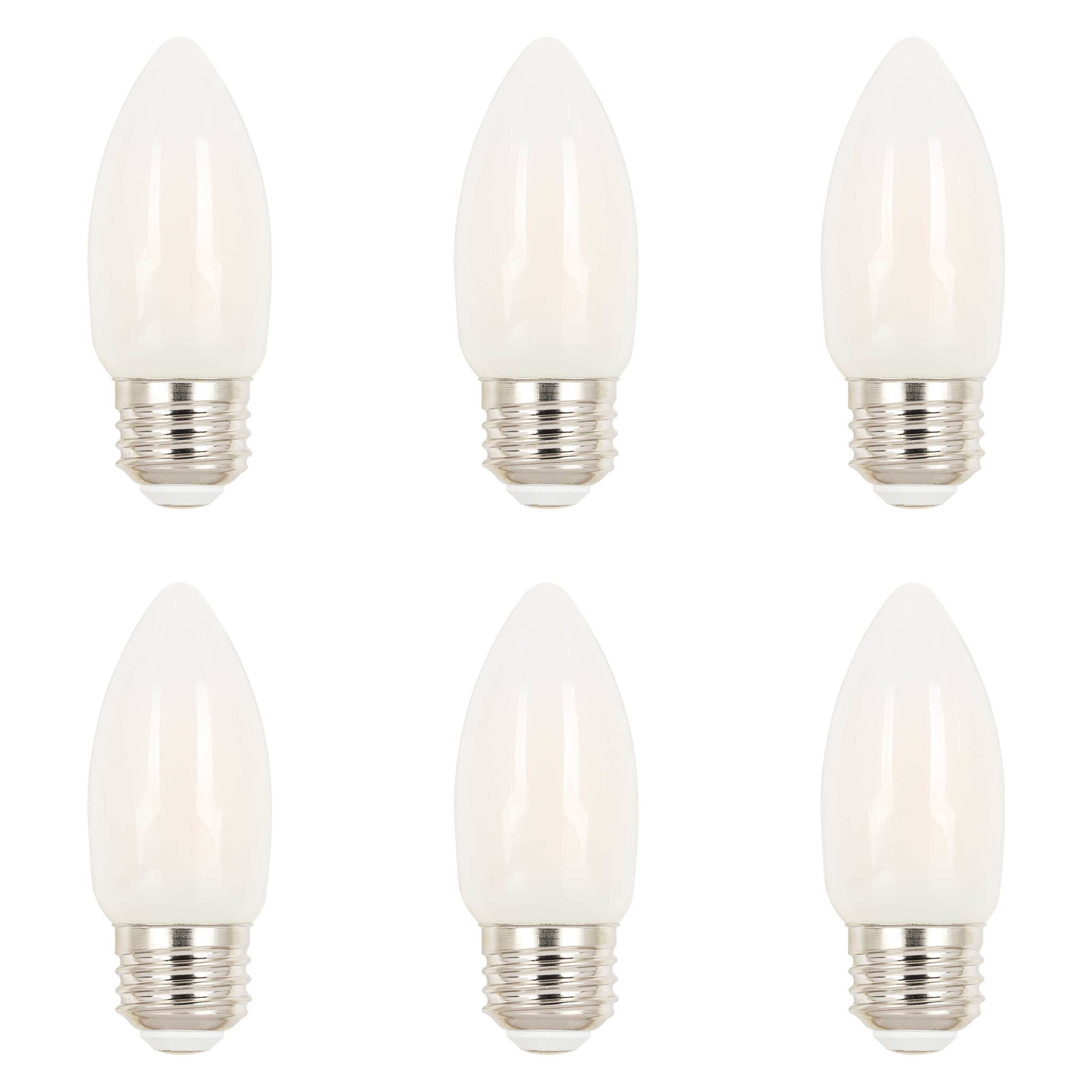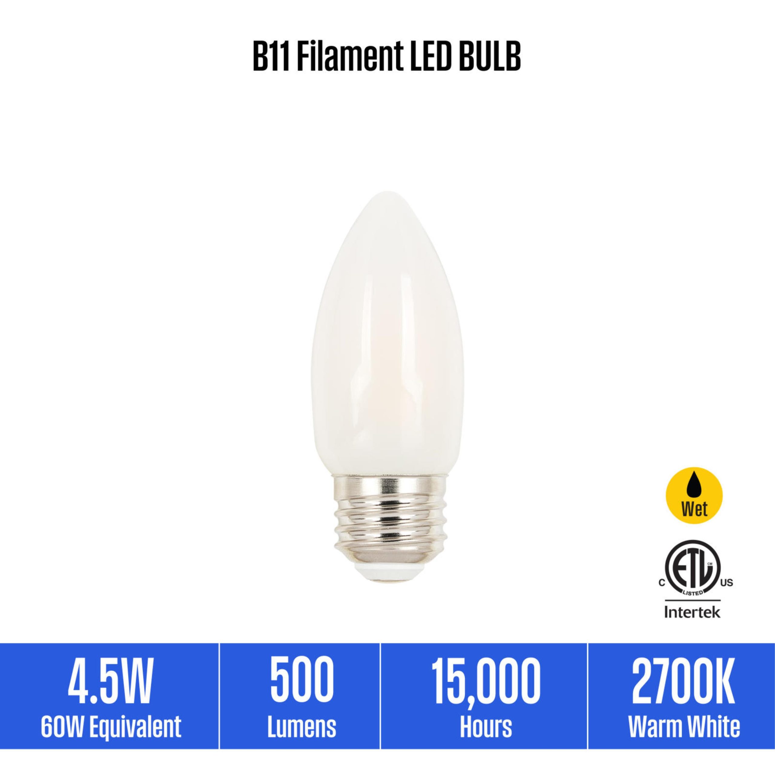 The Westinghouse 6-pack of 4.5W B11 Filament LED Dimmable Light Bulbs is an energy-saving replacement for incandescent torpedo light bulbs. These frosted finish LED bulbs illuminate instantly and are ideal for use in chandeliers and sconces, producing 2700K warm white light. Rated for wet locations and can be used in enclosed fixtures such as outdoor-rated wall and post-top lanterns. Long-lasting LEDs are mercury-free.